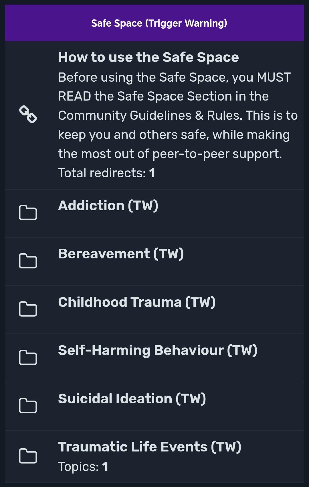- The “Safe Space” section of the CMHF is to discuss difficult topics which some users may find difficult or “Triggering”. That’s why certain Forums are grouped together and marked with a Trigger Warning, so users can decide whether or not they want to engage.